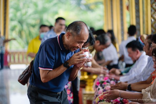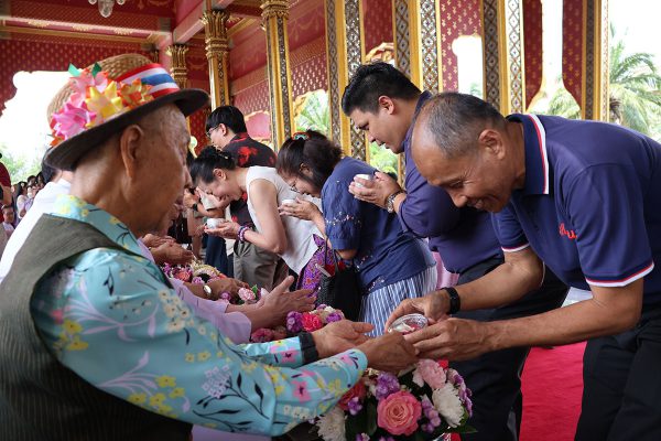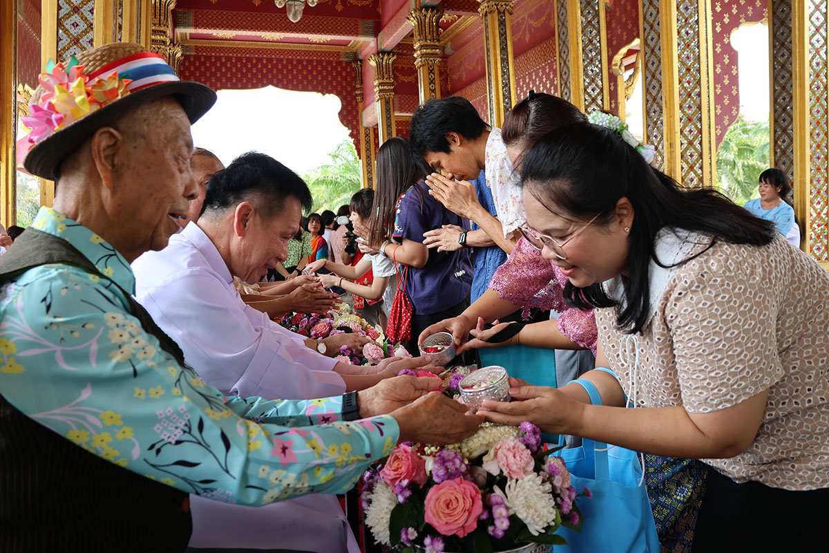The campus was filled with vibrant Thai fabrics, fragrant flower garlands, and plenty of laughter. Many took time to sprinkle scented water on the Buddha image at AU Plaza, adding a peaceful, spiritual touch to the festivities.